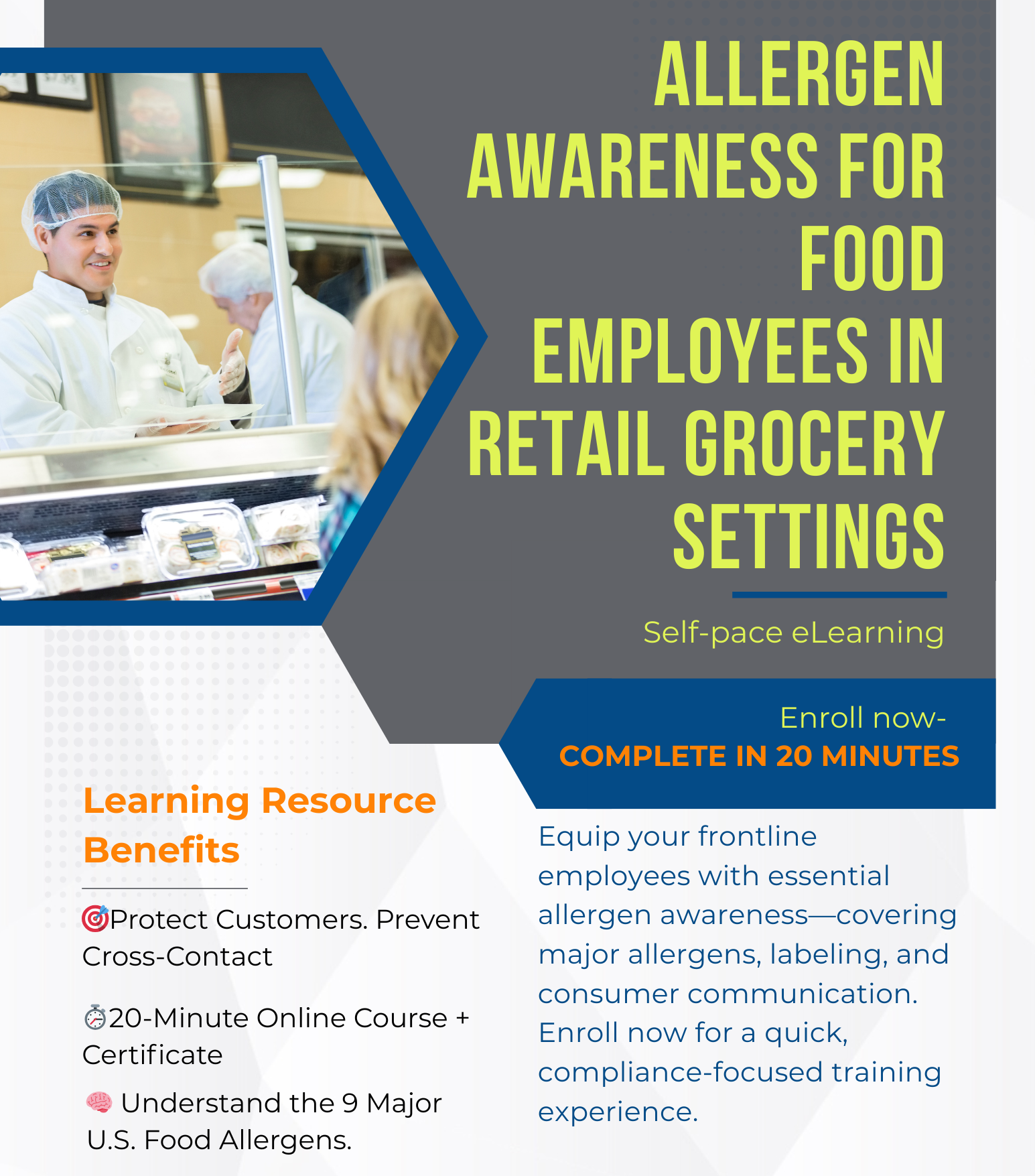 Allergen Awareness for Food Employees in Retail Grocery Settings certificate program is now available! This program was developed in partnership with The Food Marketing Industry Association and is a great fit for any comprehensive allergen management program.
